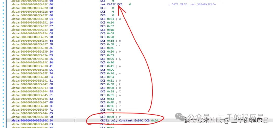 使用脚本识别到了一个常量,但是没有直接引用,说明识别到了常量表的中间部分,往上找到该数据段的头部,按 X 找到引用位置。