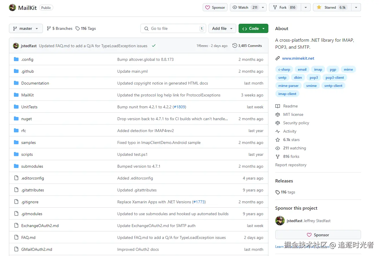 - 项目简介: MailKit是一个跨平台、开源(MIT License)、免费的.NET邮件处理库,提供强大的 API,用于发送、接收和处理电子邮件,并且它还提供了对SMTP、POP3和IMAP协议的全面支持。