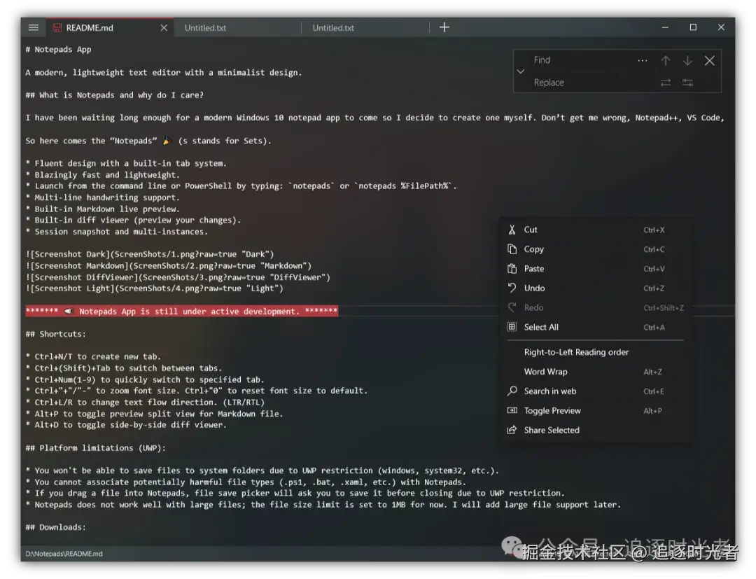 - 项目简介: 一个.NET开源、免费(MIT License)、现代、轻量级、具有极简主义设计的文本编辑器。