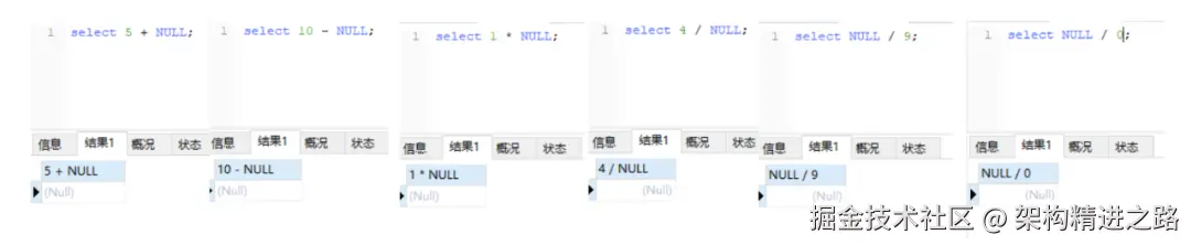 在进行乘法、除法等其他运算时,只要有一个操作数为 NULL,结果就会是 NULL