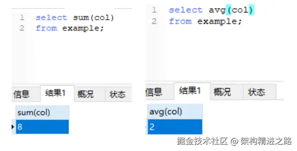 常见的聚合函数有 count、min、max、avg 以及 sum,这些聚合函数在遇到 NULL 值时,处理方式各不相同: