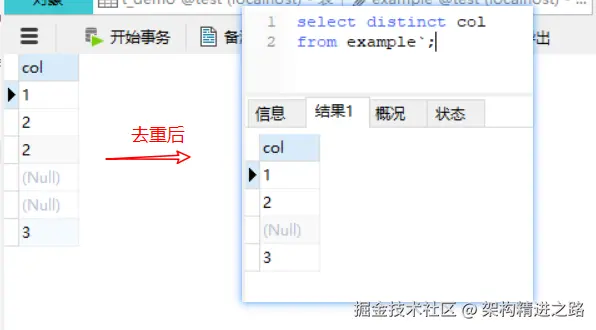 当使用 distinct 对这个字段进行去重操作时,所有的 NULL 值会被视为同一个值,只显示一次。同样,在使用 group by 进行分组操作时,NULL 值的记录会被分到同一组中。