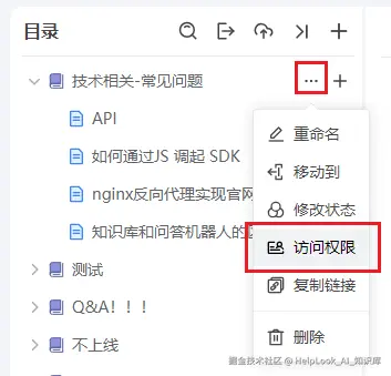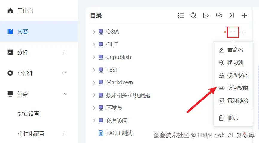 ③在页面左侧的内容,找到需要配置访问权限的栏目/文章,点击“…”,选择“访问权限”,即可给特定的用户配置访问权限