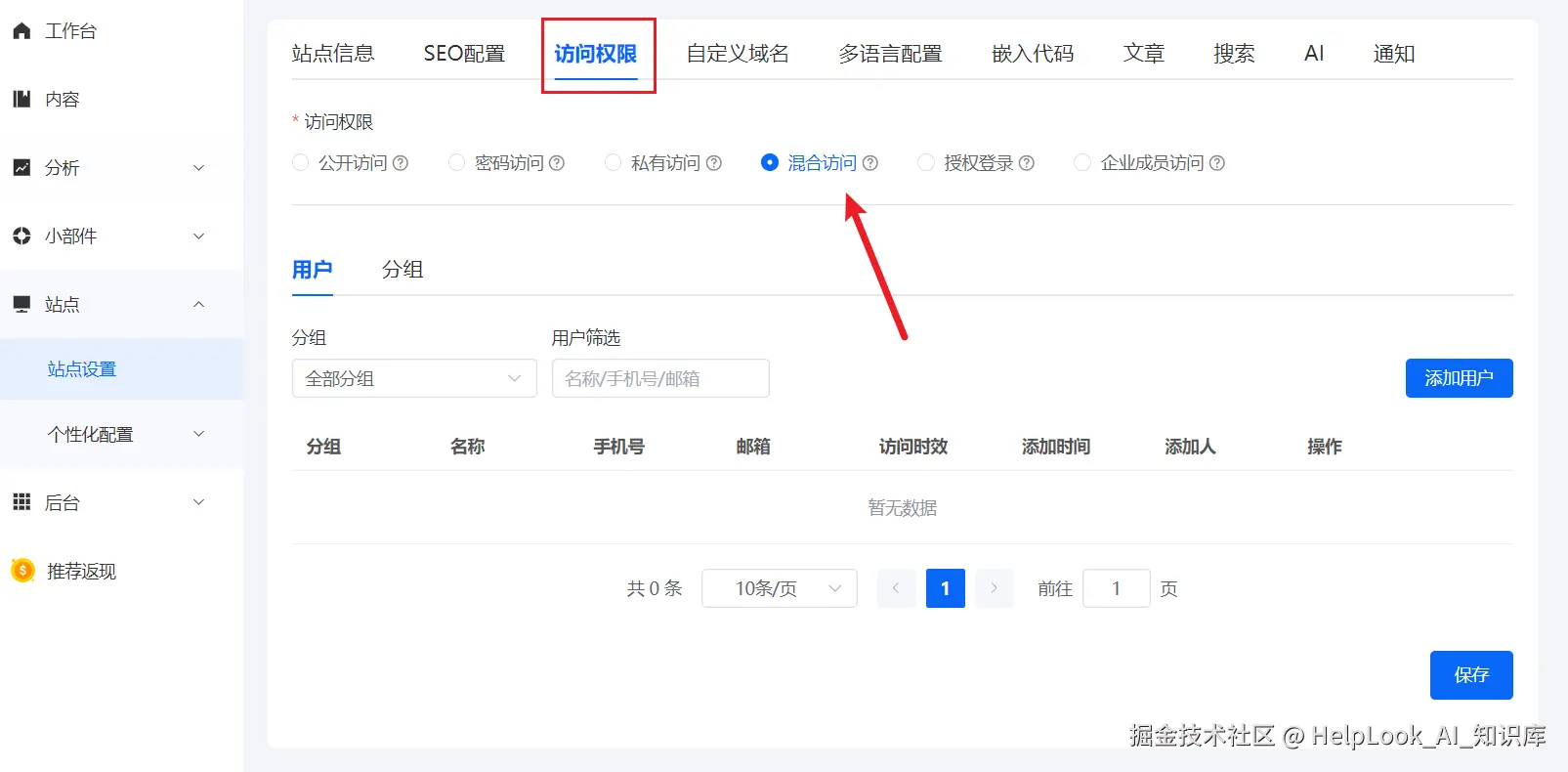 只需简单几步,即可在页面左侧的站点设置中选择 “访问权限” ,添加需要配置的用户,并为特定的栏目或文章设置访问权限: