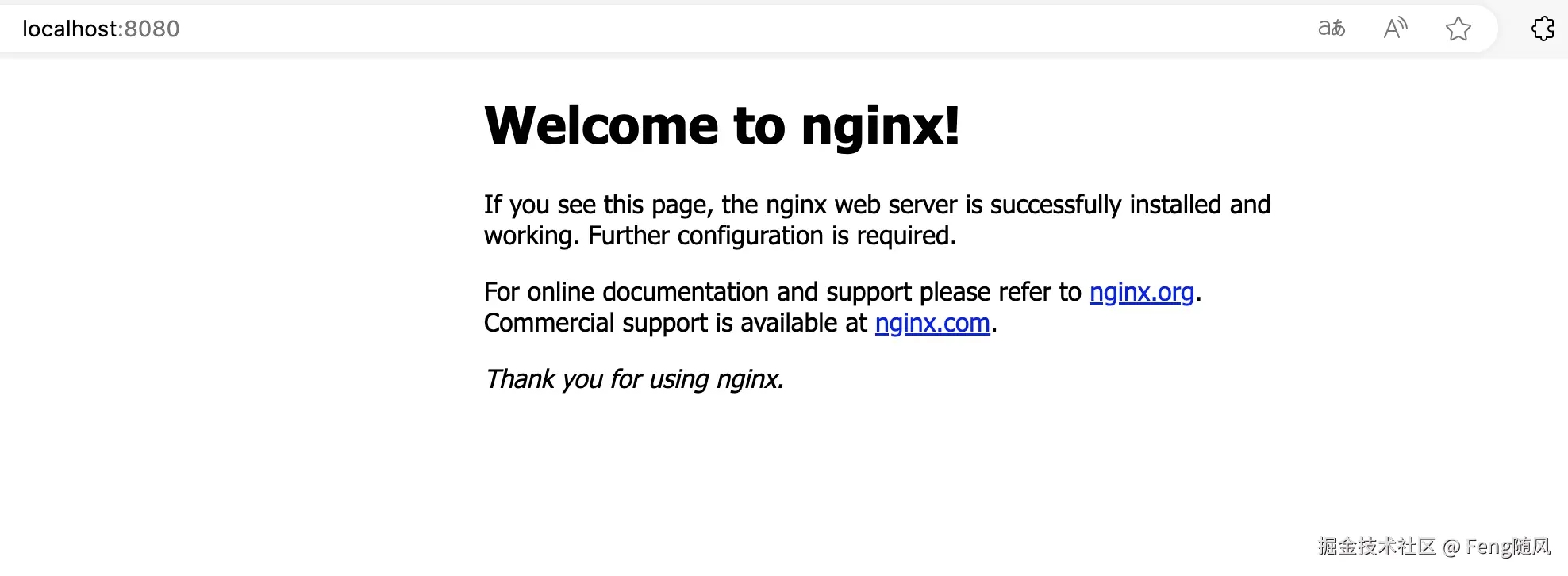 浏览器输入http://localhost:8080,看到以下界面说明Nginx服务已正常运行