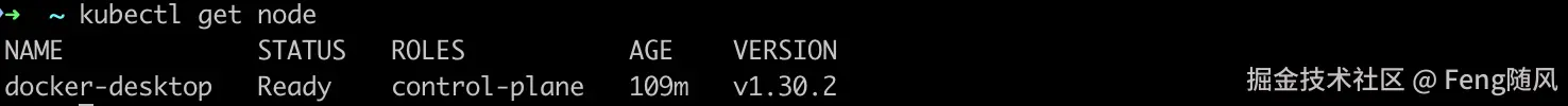 查看Node节点,可看到节点名称为docker-desktop,VERSION为v1.30.2