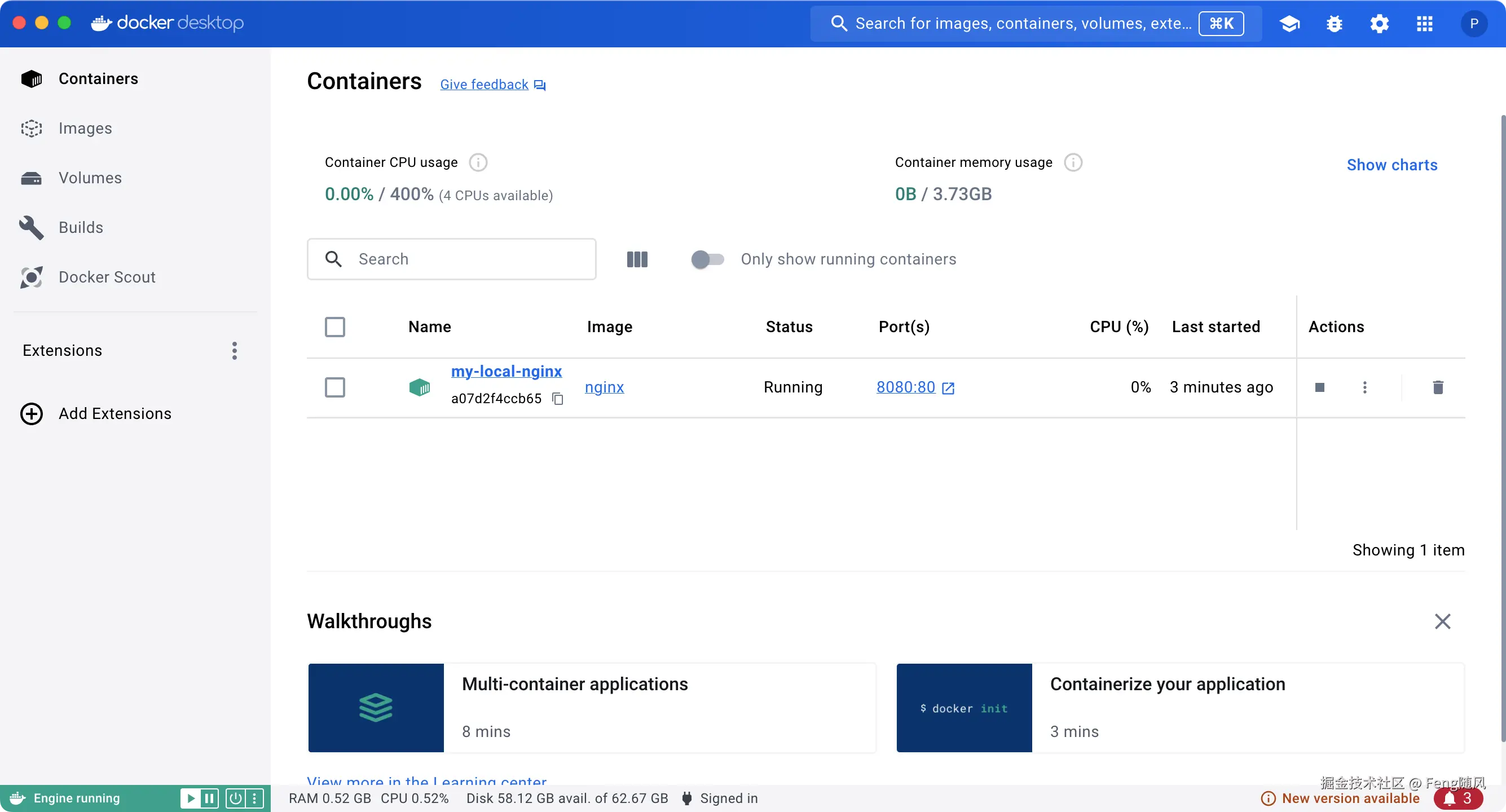 在Docker Desktop的「Containers」页,同样能看到Nginx容器
