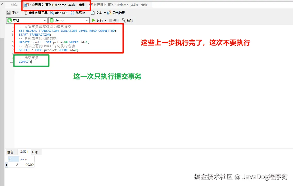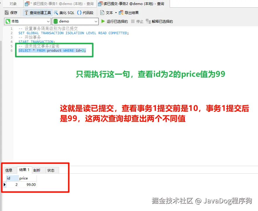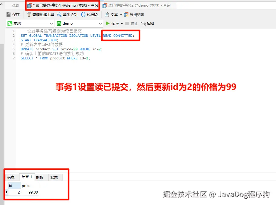 事务1设置事务隔离级别为读已提交,开启事务,修改产品表id=2的price为99,注意这里并未提交事务。