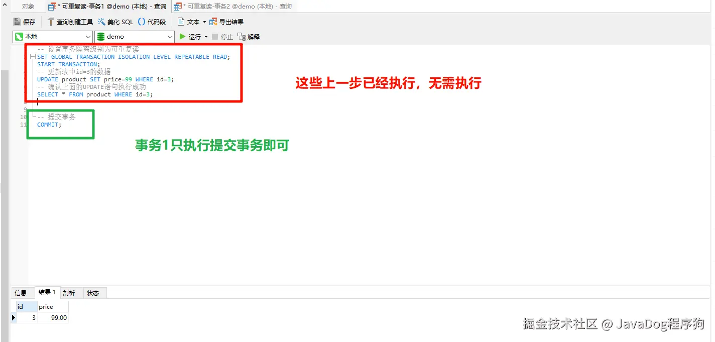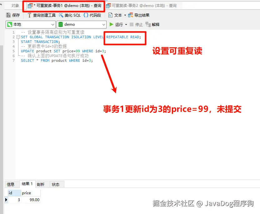 事务1设置事务隔离级别为可重复读,开启事务,修改产品表id=3的price为99,注意这里并未提交事务。