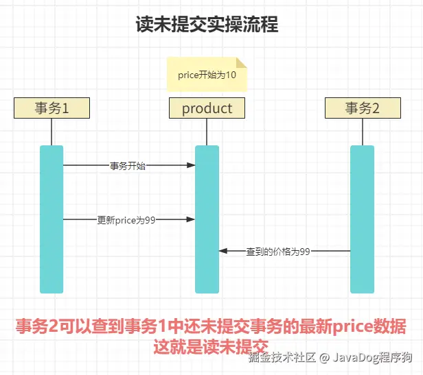 事务2设置事务隔离级别为读未提交,去查看产品表id=1的price,结果是99,也就是读到了事务1中还未提交事务的值