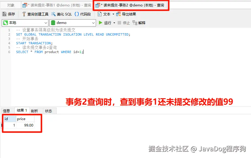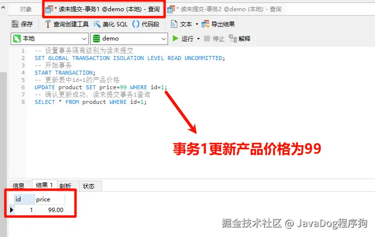 事务1设置事务隔离级别为读未提交,开启事务,修改产品表id=1的price为99,注意这里并未提交事务。