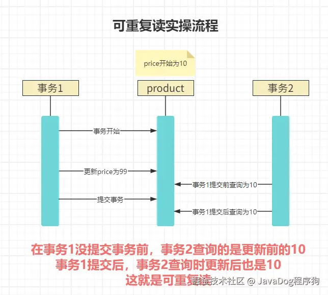 🌰现实例子:假设你在网上购物,第一次查看某商品的价格是100元。然后你去干别的事情,比如接了个电话。当你再次查看同一件商品的价格时,发现它变成了90元,因为在这段时间里商家做了促销活动降低了价格。这就像是在一个事务中两次查询同一商品的价格,但得到了不同的结果。