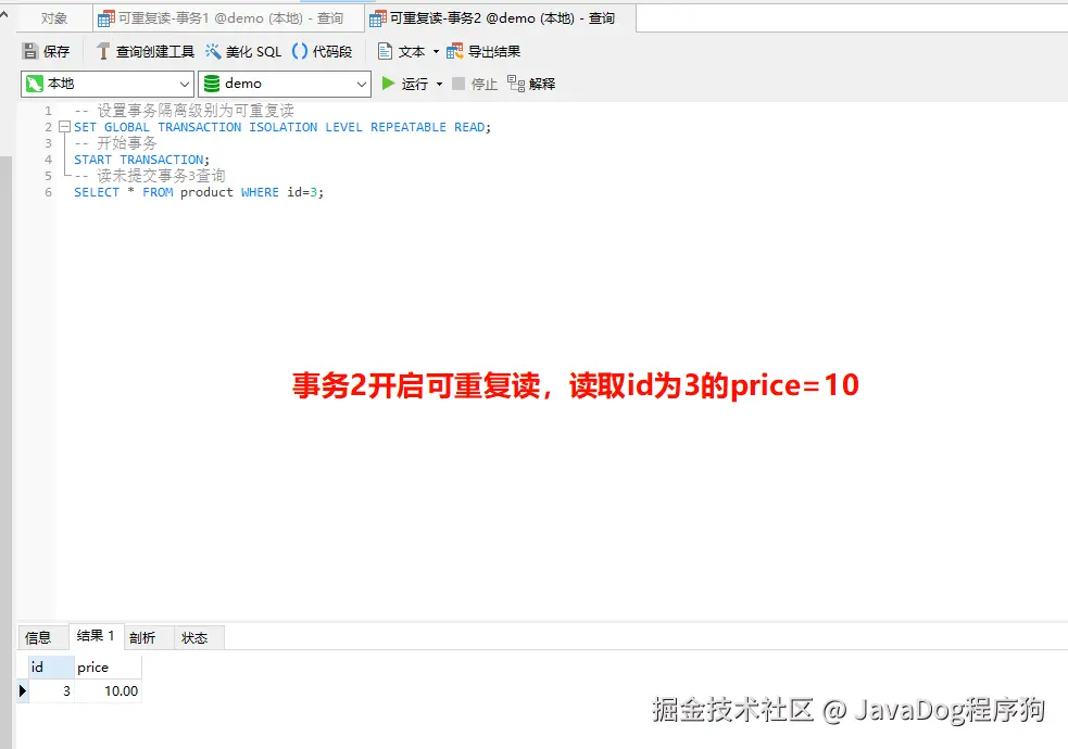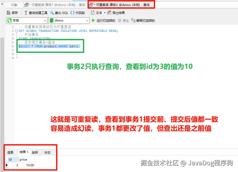 事务1已提交,**去查看产品表id=3的price,结果还是10,也就事务1提交后也是重复读取提交前的10