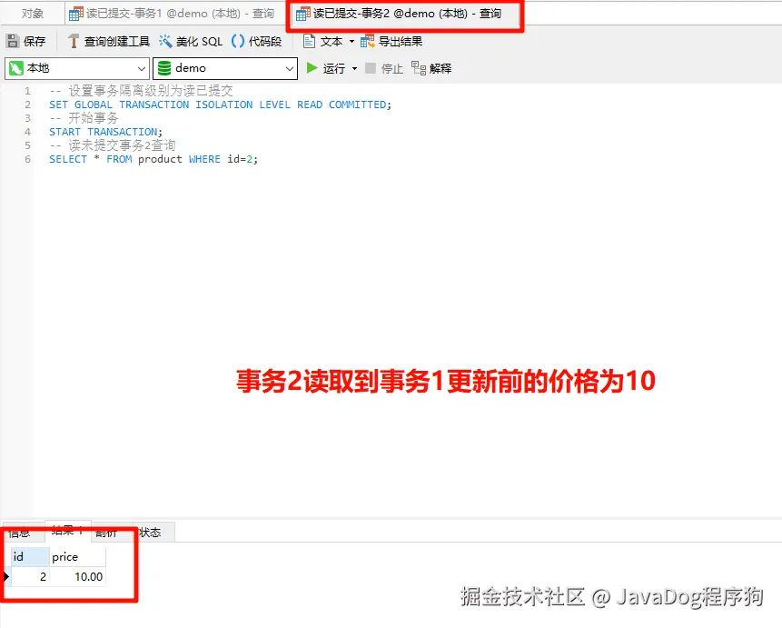 事务2设置事务隔离级别为读已提交,**去查看产品表id=2的price,结果是10,也就事务1更新前的值