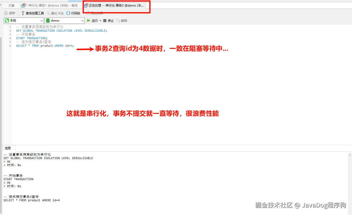 事务2设置事务隔离级别为串行化,去查看产品表id=4的price,结果一直阻塞中等待