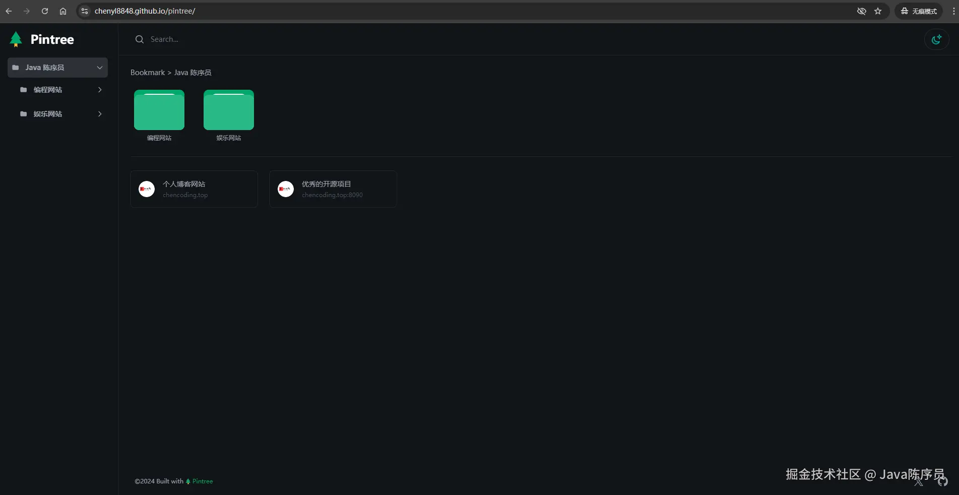 Pintree 是一个开源项目,旨在将浏览器书签导出成导航网站。通过简单的几步操作,就可以将书签转换成一个美观且易用的导航页面。