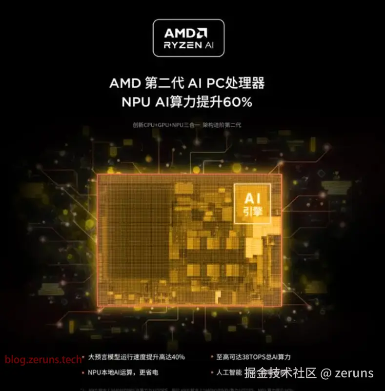 但是,锐龙7 8845H毕竟是AMD第二代AI PC处理器,官方对NPU,也就是AI引擎部分进行了调优,AI算力从10TOPS(万亿次)提升到了16TOPS,而且整体算力(CPU+GPU+NPU),也同步从32TOPS增加到38TOPS(锐龙9 8945HS是39TOPS),比酷睿Ultra的34TOPS还要更高一些,为端侧AI的加速奠定了更好的基础。