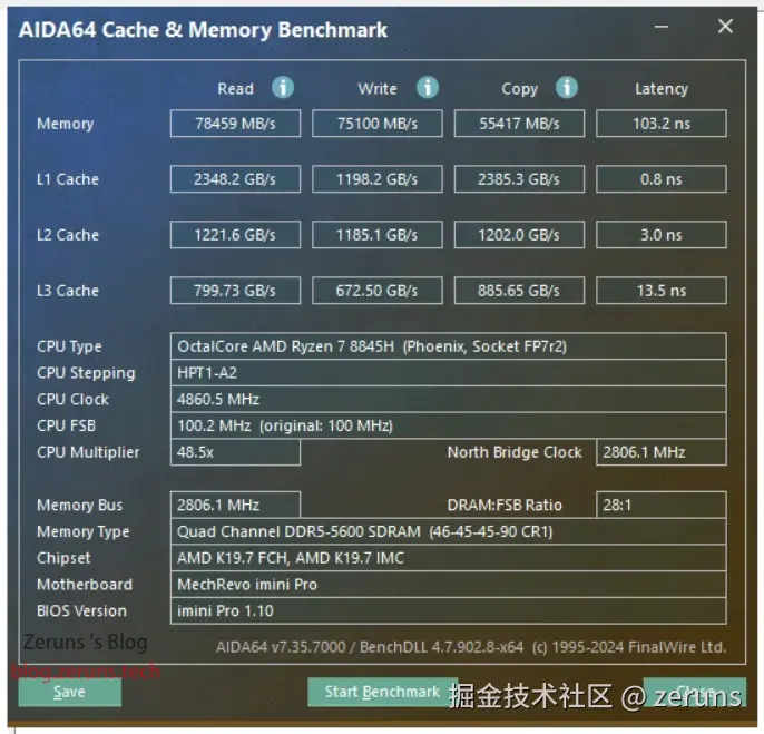 测试软件是AIDA64 Cache & Memory Benchmark,内存读取速度78459MB/s,写入速度75100MB/s,延迟103.2ns