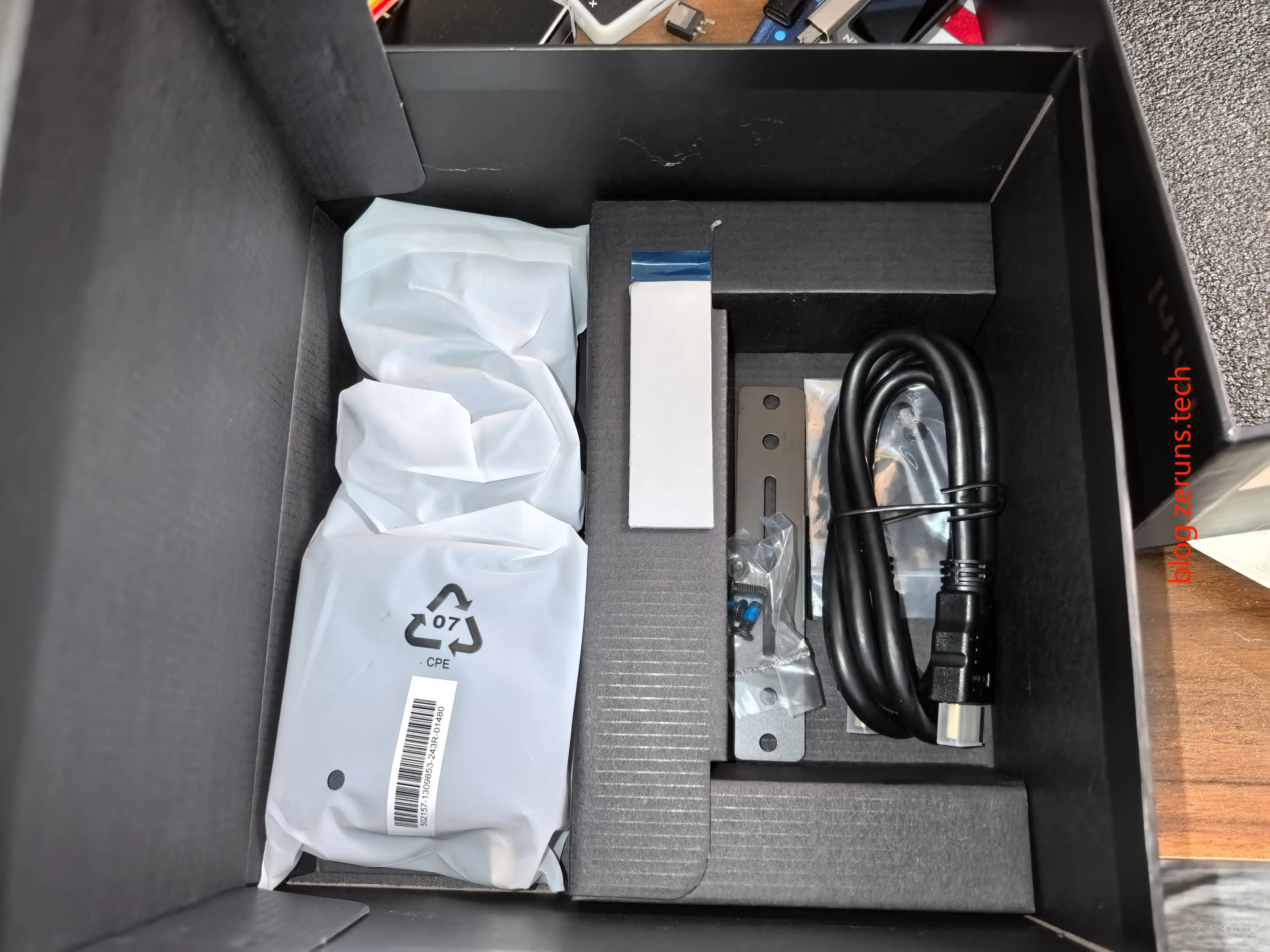 再下面一层是配件,有电源适配器,HDMI视频线,VESA安装支撑架,固定螺丝,说明书和硬盘用的导热硅脂垫。