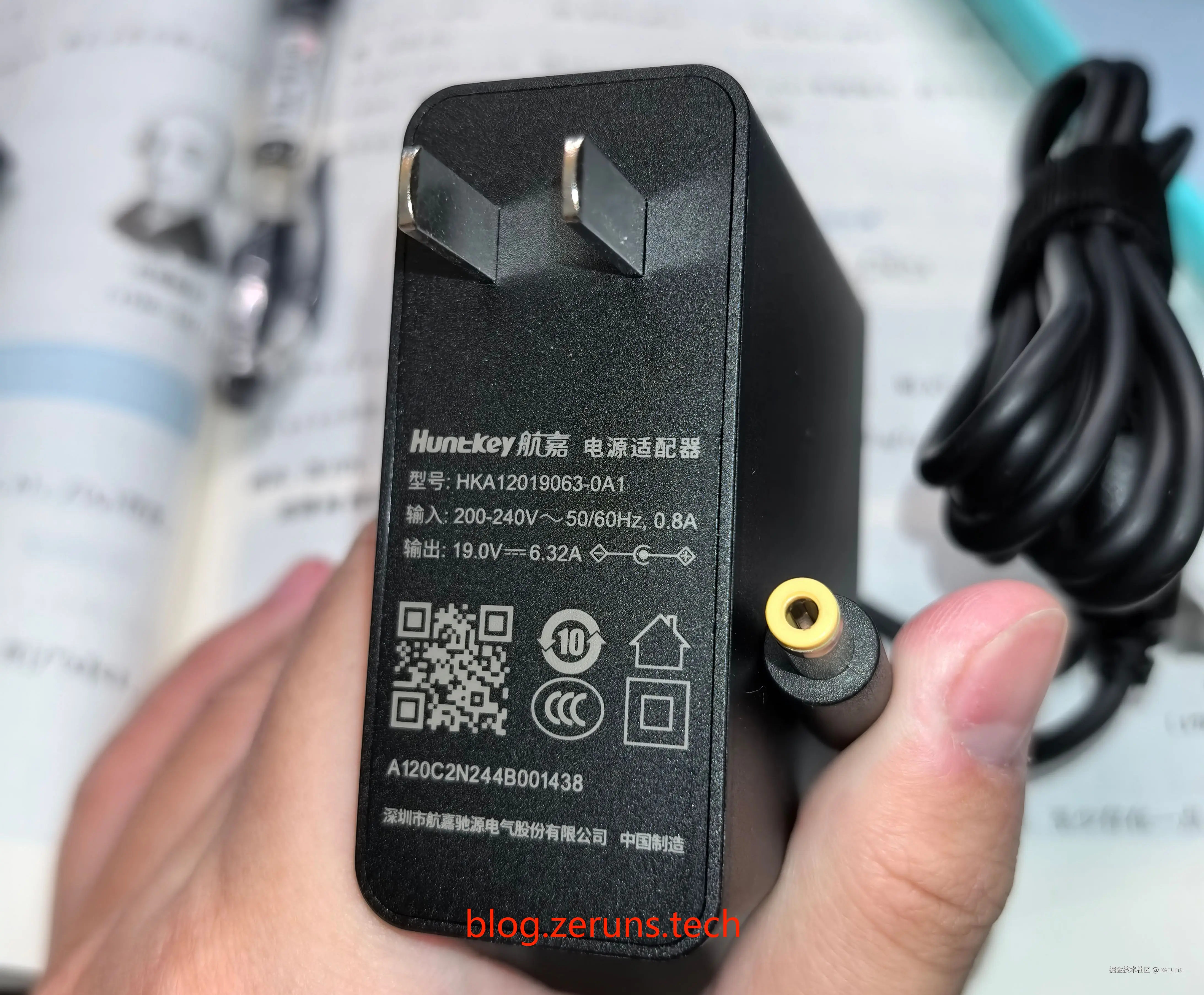 电源是航嘉的HKA12019063-0A1,输入电压范围200-240V,不支持宽电压输入,输出电压为19V,输出最大电流6.32A,最大输出功率120W,电源输出接口是DC5.5x2.5。