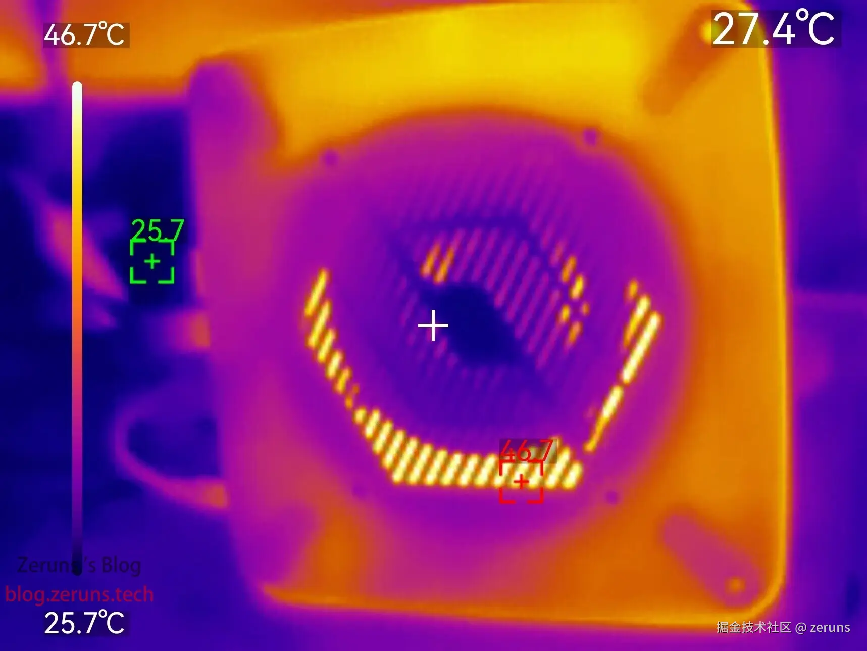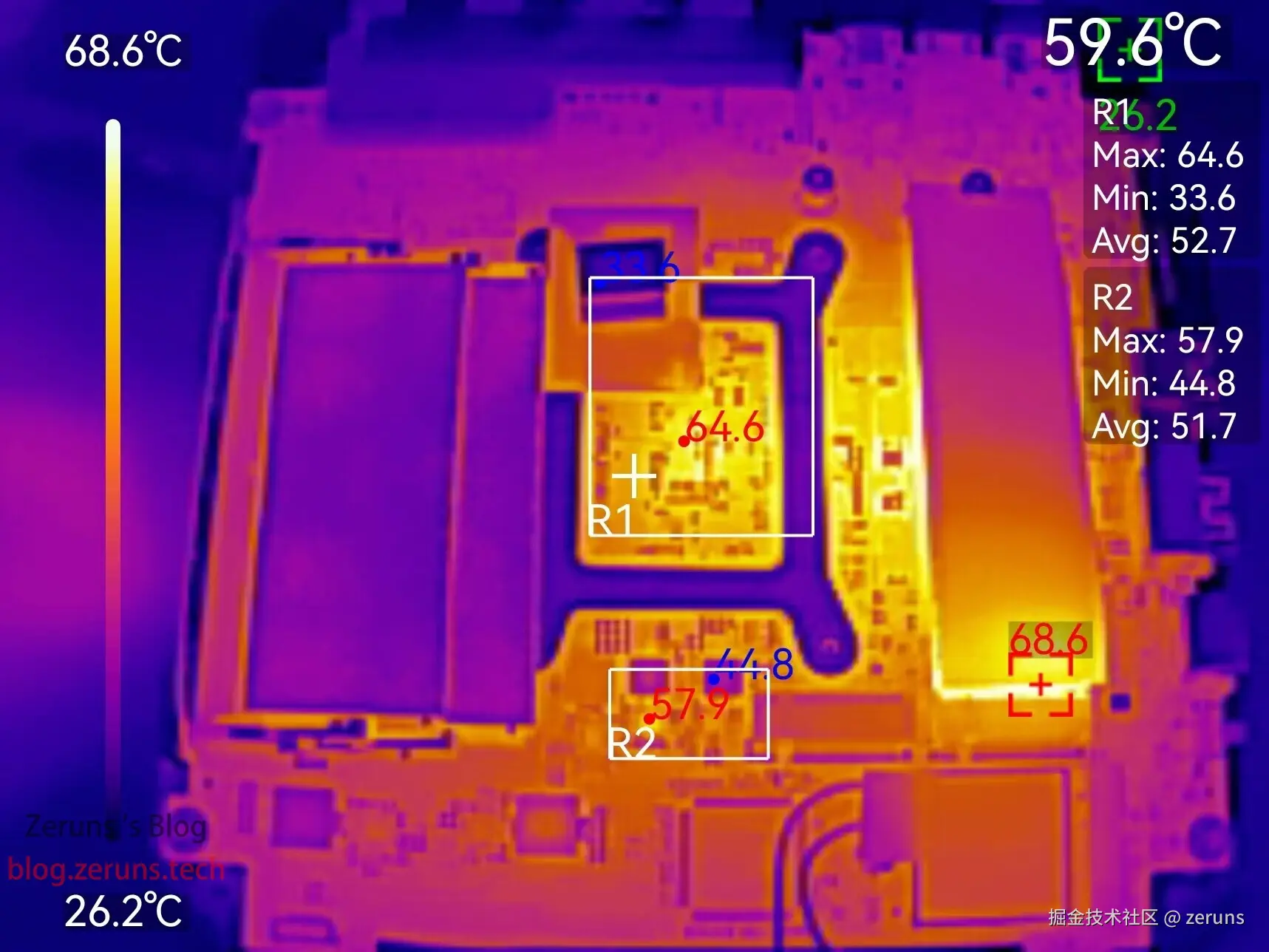 拆掉顶盖后的热成像图,固态硬盘主控温度68.6度。