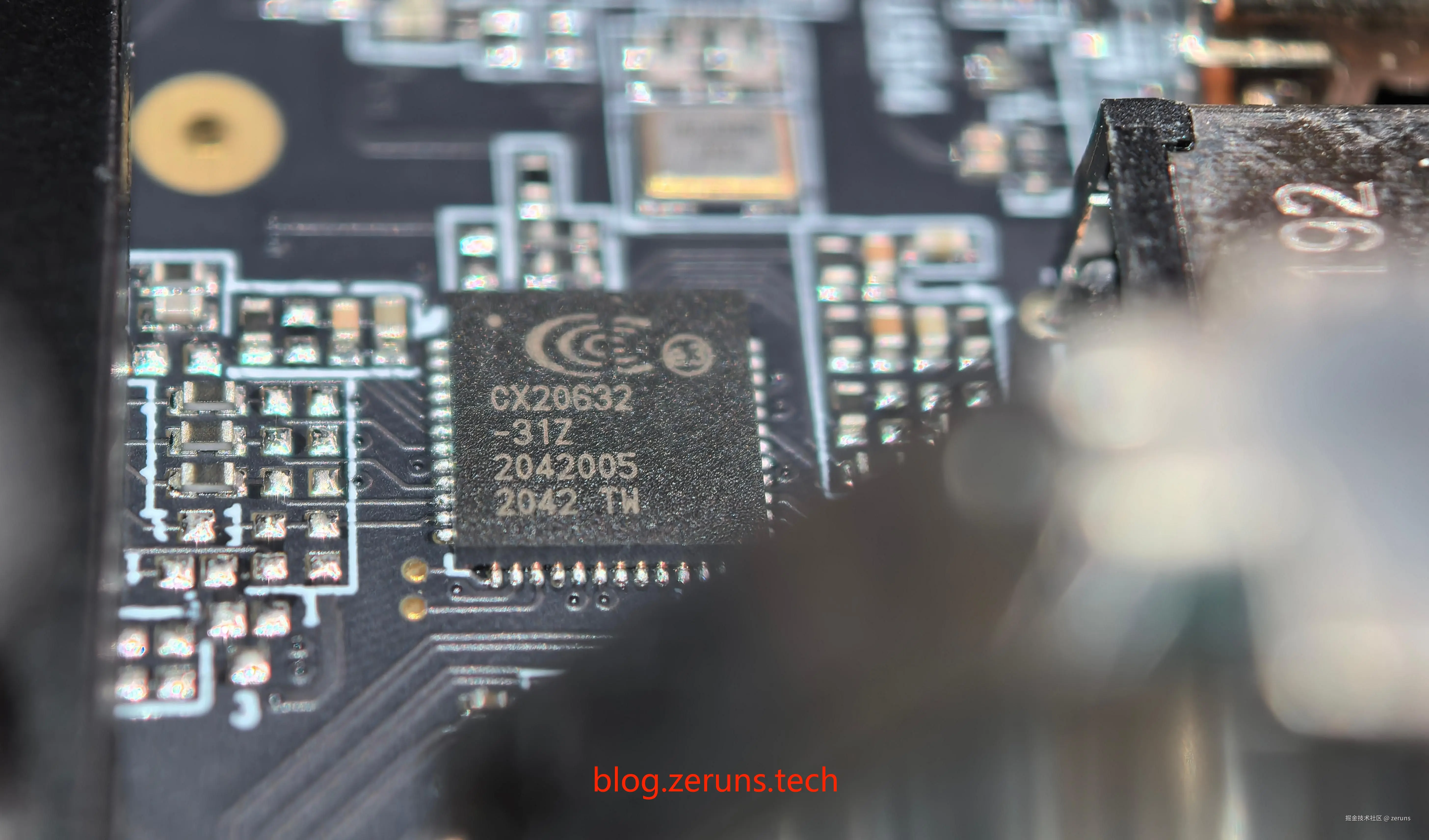 3.5mm音频接口旁是科胜讯的CX20632声卡芯片,这款芯片支持5.1声道环绕声输出。