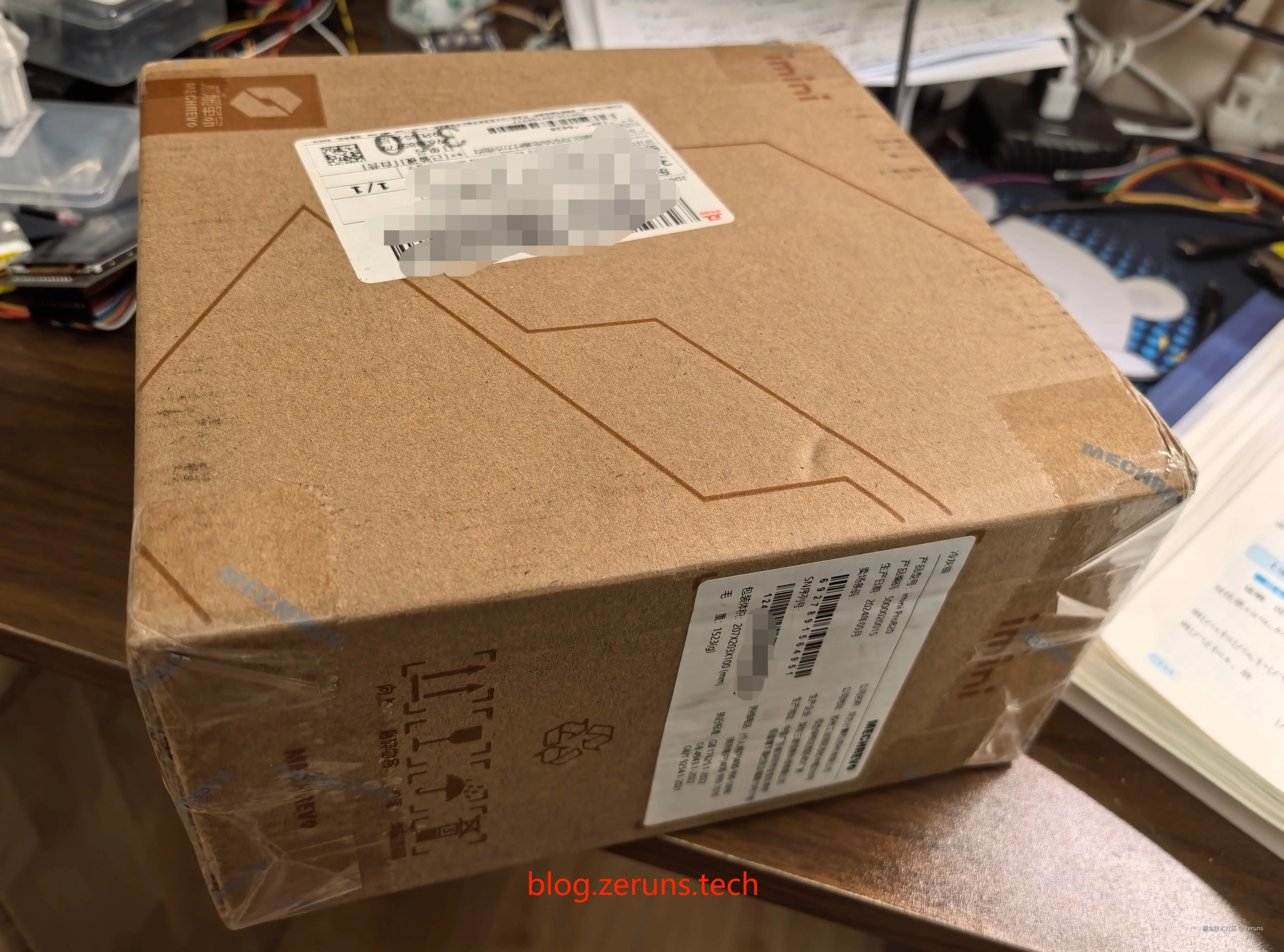 快递箱,侧面贴纸印着机型和序列号。