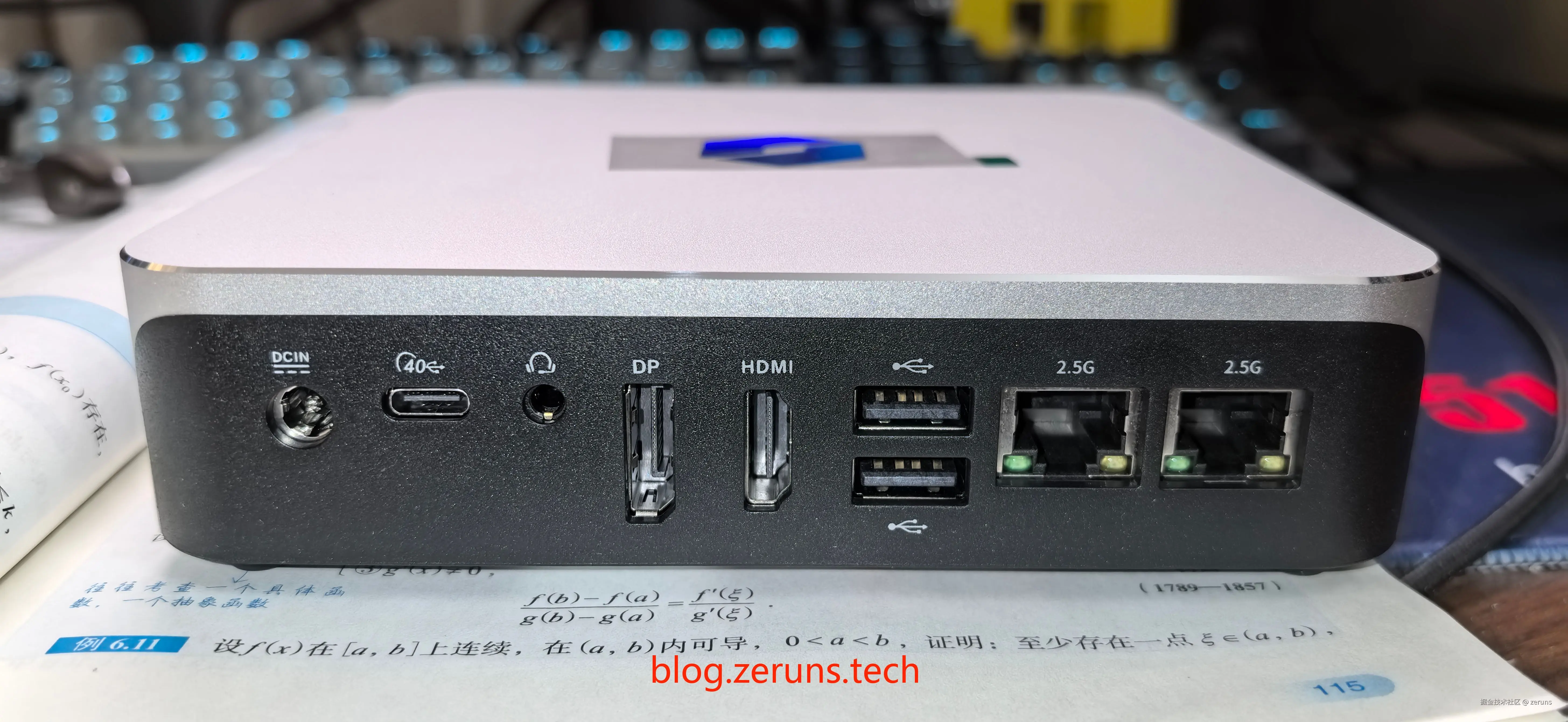 机器背面,从左到有分别为:DC电源接口,40Gbps的TypeC(USB4),3.5mm耳机接口,DP视频接口,HDMI2.1视频接口,两个USB2.0接口,两个2.5G网口。