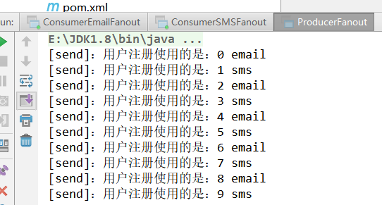 pro不是直接操作队列,而是将数据发给交换机,由交换机将数据发给与之绑定的队列。从不加特定参数的运行结果中可以看到,两种类型的消费者(email,sms)都收到相同数量消息。