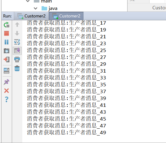 Pro发送了50条消息进入队列,而上方消费者启动图里很明显的看到轮询的效果,就是每个消费者会分到相同的队列任务。