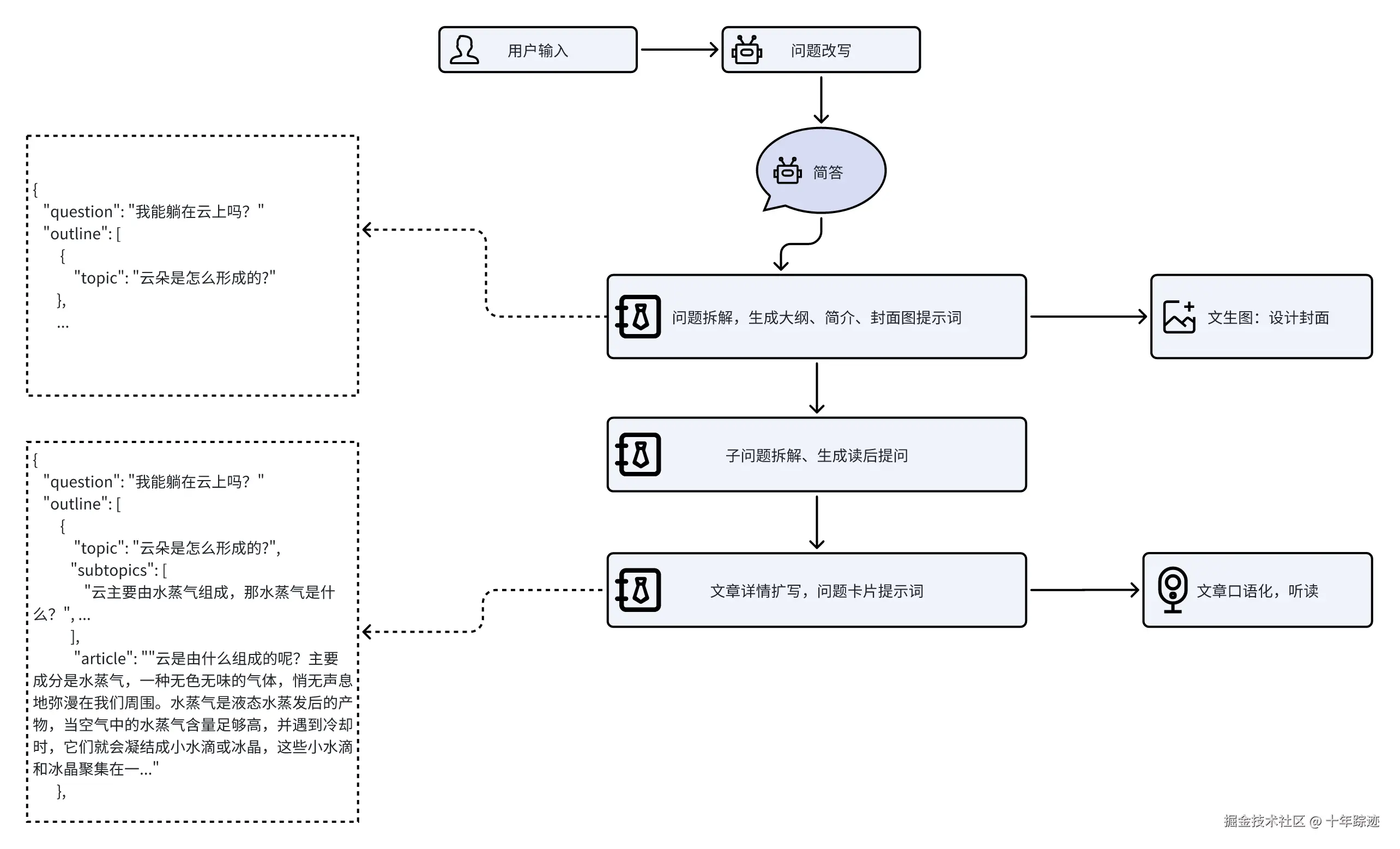 可以看到,从用户输入话题,到最终生成内容,经过了问题改写、简答、大纲、子问题拆解和文章生成等好几个步骤,中间还穿插并行生成封面和口语化内容,这些内容都需要通过LLM的工作流编排来实现。