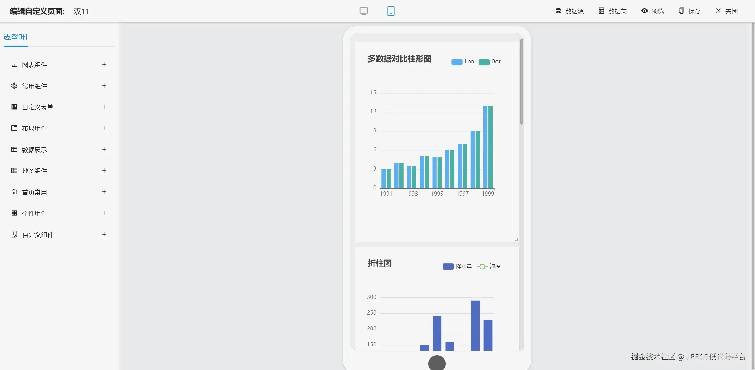 - 在线配置报表(无需编码,通过在线配置方式,实现曲线图,柱状图,数据等报表)