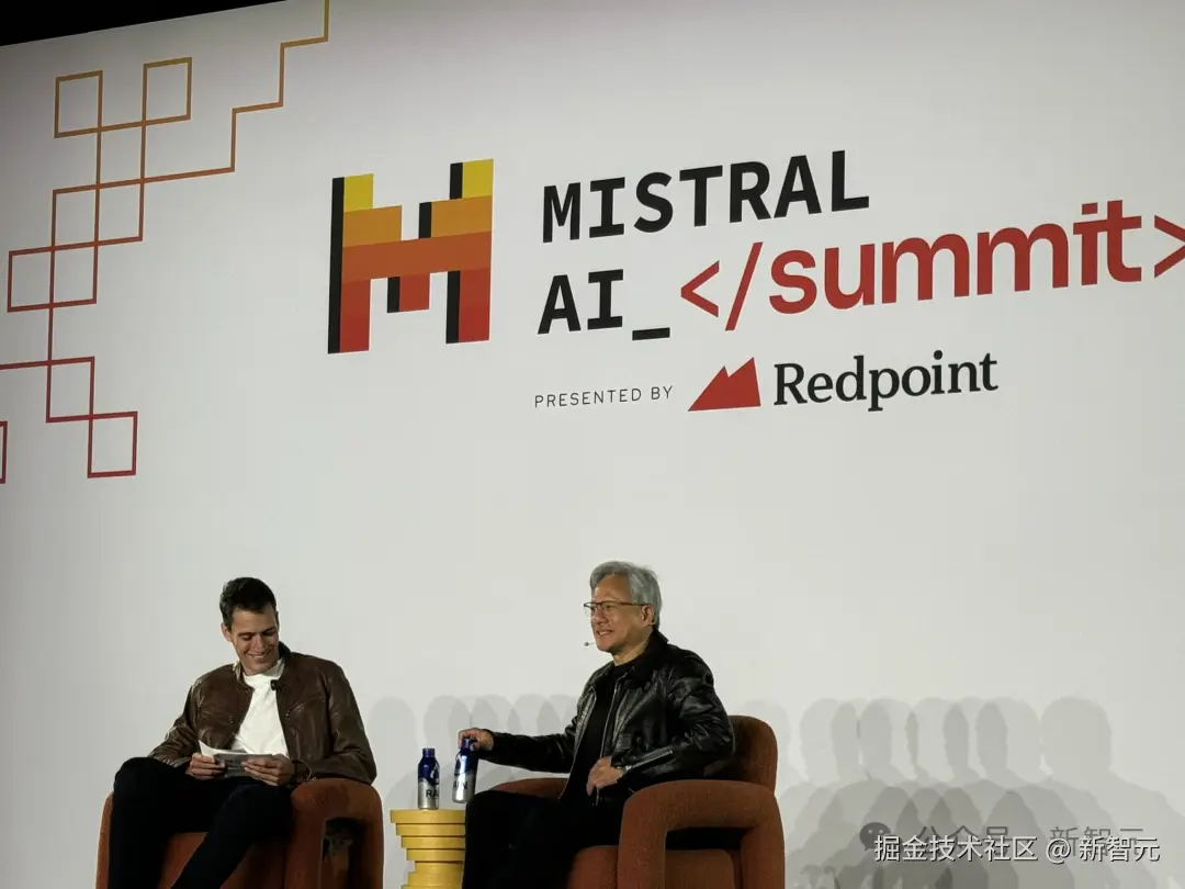 创始人 Arthur Mensch 穿上皮夹克和老黄坐在台前,开启了炉边谈话,一起探讨了未来 AI 和算力问题。