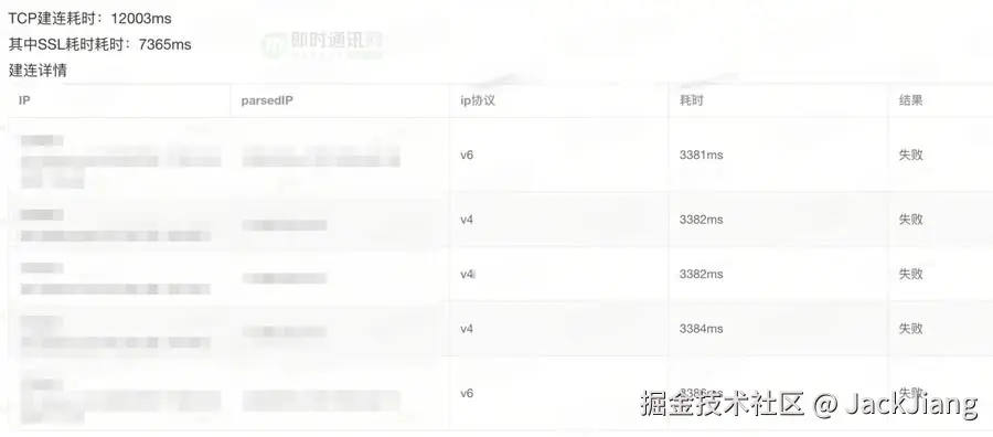 **我们来看一个例子:**用户A访问 cdn.poizon.com 是DNS共响应了10个IPv6、10个IPv4,然而此用户IPv6无法访问,且给个IPv6都是建连10秒后超时,最终导致用户在第100秒时才在第11个IPv4地址上成功。