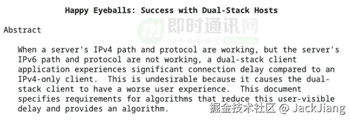 正如 RFC6555 摘要中描述的那样,当服务器的 IPv4 路径和协议正常,但IPv6 路径和协议不工作时,相对于IPv4单栈客户端,双栈客户端会经历显着的连接延迟。而这个延迟通常是10秒以上(IPv6的个数和建连超时时间的乘积)。