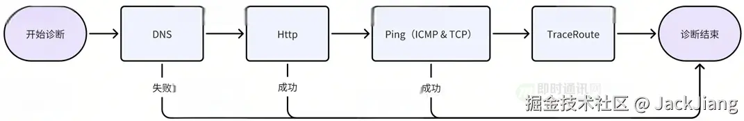 1) 单域名诊断流程:我们会依次进行DNS、Http、Ping(ICPM)与Ping(TCP)、TraceRoute诊断。如果是双栈客户端(同时返回了IPv4与IPv6),那么我们会选择首个IPv4与首个IPv6同时进行Ping/TraceRoute以确认不同IP类型的联通情况。