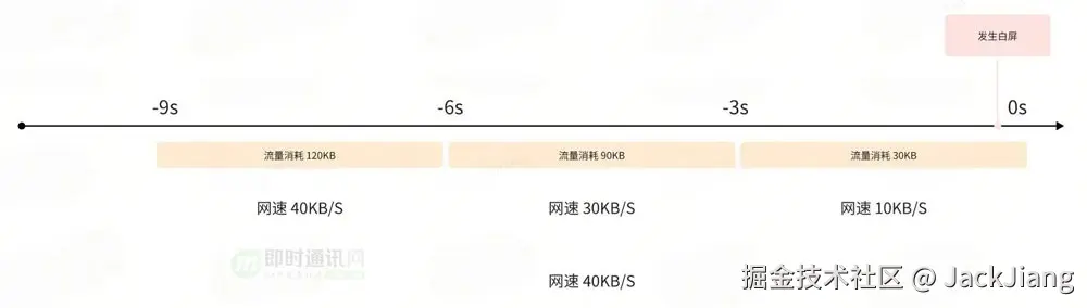 我们以3秒为间隔分段计算并取最大值来排除波动,这样我们就得到了白屏问题发生前一段时间内的网速状态,过低的就可以判定为弱网/无网。