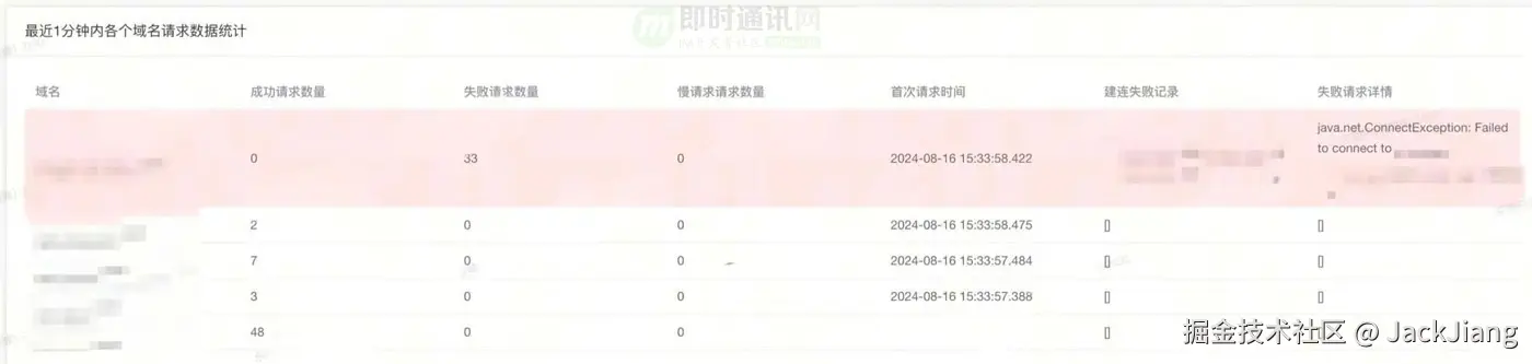 为此我们记录了主站接口的域名,以及所有CDN域名在最近N分钟内的请求统计,包括了正常请求、慢请求、失败请求的数量和原因,以及失败请求使用的具体IP。
