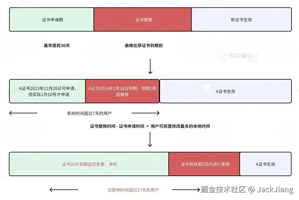 得物目前有100+的域名,CA证书的申请对于CA机构来说,一般在证书有效期小于30天时会进行新证书的签发流程,且证书有效期以申请期时间为准。但过往的证书有效期更新替换后,往往会面临时间前置的用户无法通过CA证书校验,最终引起用户白屏。