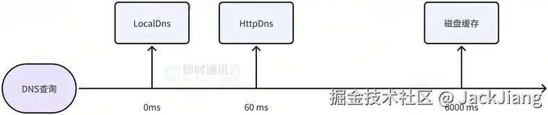 在LocalDNS的基础上,我们增加了HttpDNS,磁盘缓存来优化DNS问题。其中HttpDNS在第60ms异步启动,磁盘缓存在第6秒钟时异步启动。三种查询方式任意一个返回,则DNS结束。
