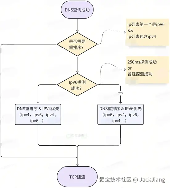 最合理的方式自然是按照RFC6555描述的那样实现快乐眼球算法,但是开发成本和风险都较大。而线上时而有类似反馈。因此我们决定分两步走,先上线低风险的IPv6探测&重排序解压此困境,再实现快乐眼球算法。