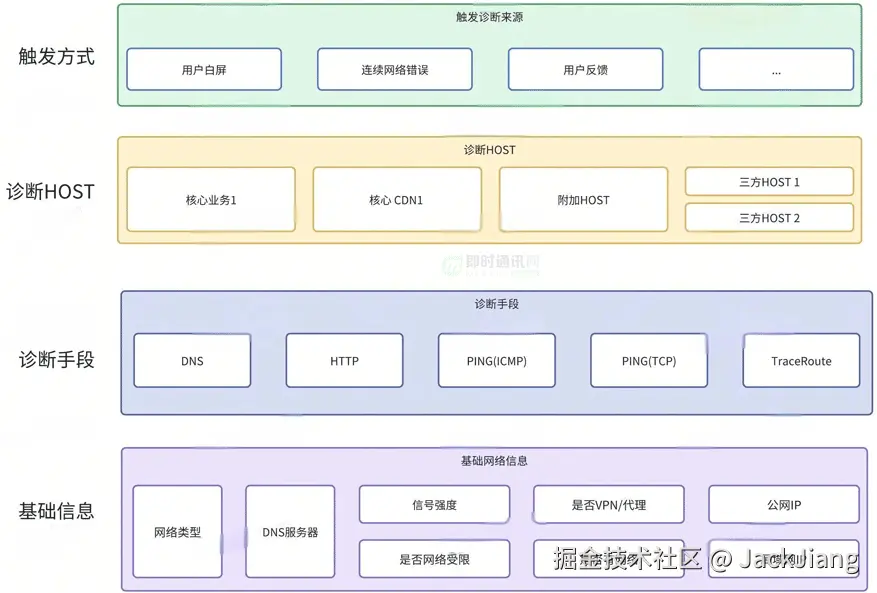 尽管我们有专门的网络诊断工具,但是考虑到网络异常的滞后性,故障往往是数十秒之前引入的(例如进电梯弱网),而发生问题之后才触发的网络诊断结果仅能作为参考,并不能作为最终问题归因的证据。
