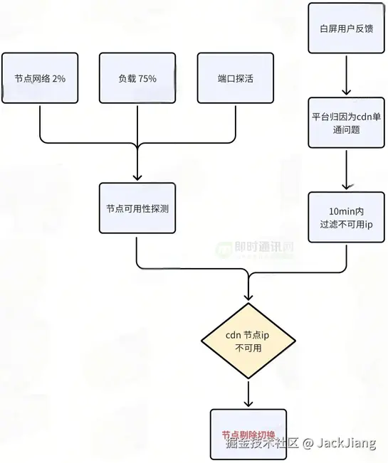 我们针对云厂商的到端链路监控以及白屏用户反馈的潜在非到端问题,通过平台归因1min内的CDN请求 & 网络诊断的情况,并经过人工确认为CDN单通问题后,进行节点剔除切换,优先处理节点抖动带来的影响面问题。