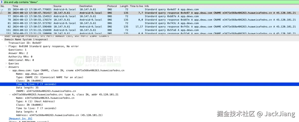可以看到电信的LocalDNS服务器并未遵守TTL时间(app.dewu.com 的 TTL为60),而是进行了额外的缓存。这是部分运营商为了降低客户端的查询频率(降成本)而搞出的小把戏,不在我们的讨论范围内。