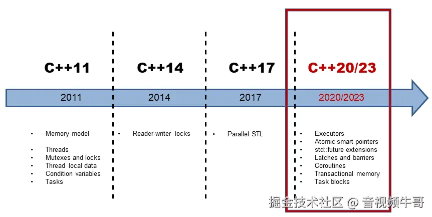 C++11、C++14、C++17、C++20和C++23是C++语言标准的不同版本,它们之间在功能、特性和语法上存在一些区别。以下是对这些版本主要区别的概述: