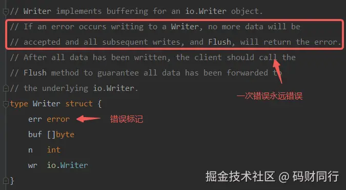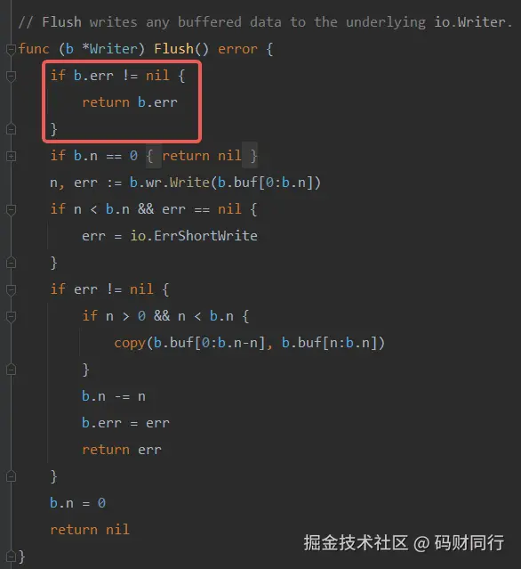 如果发生了一次 Write 错误,后续的 Write 都会失效,直接返回错误, Flush 也会错误。