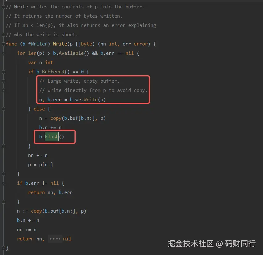 因为默认的buf长度是 4096,因此超过buf长度的写入,肯定要先把buf填满,然后调用Flush 把已有数据刷新到磁盘之后再继续写入。这里 Go 还做了额外的优化:如果buf原来是空的,就直接写入文件系统中,不再缓存: