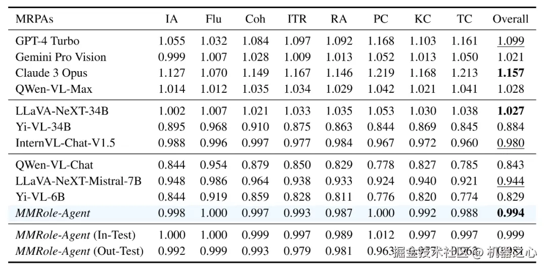 表 1:MMRole-Eval 评测结果。In-Test 表示在训练集中出现过的角色上的测试,而 Out-Test 表示在训练集中未见过的角色上的测试。