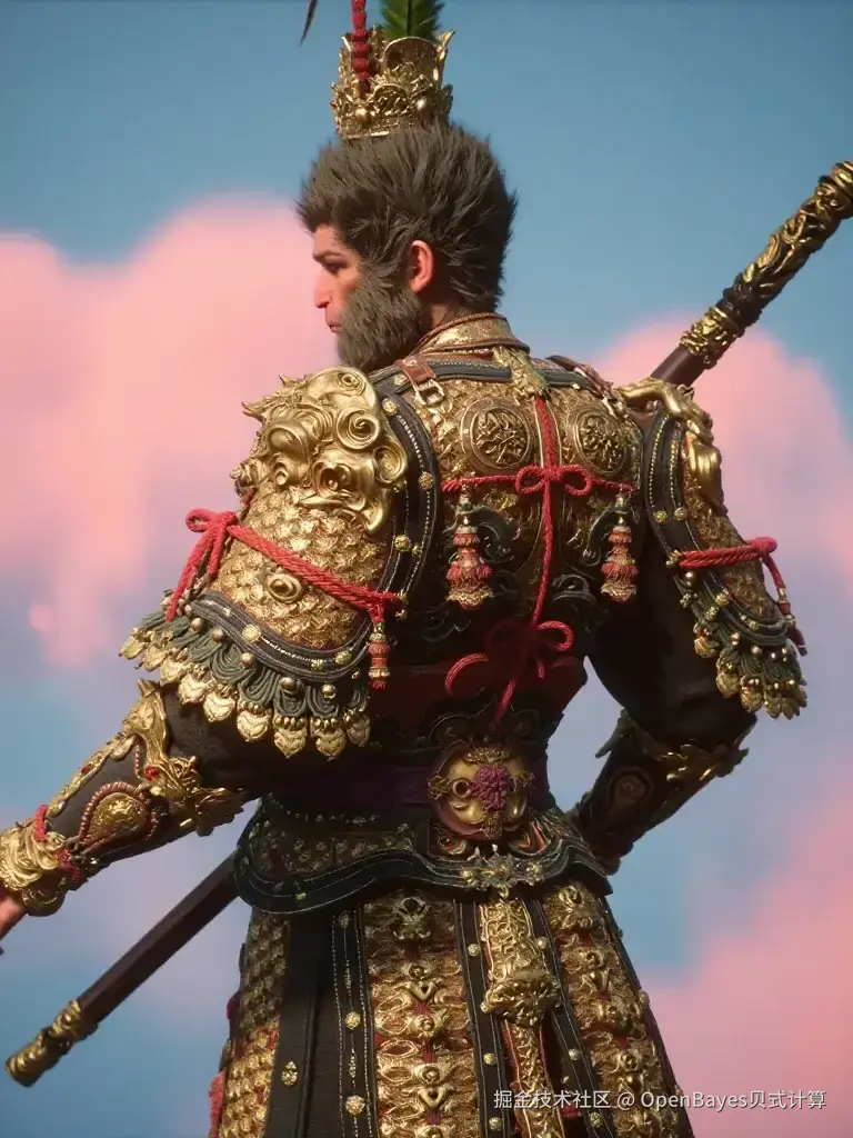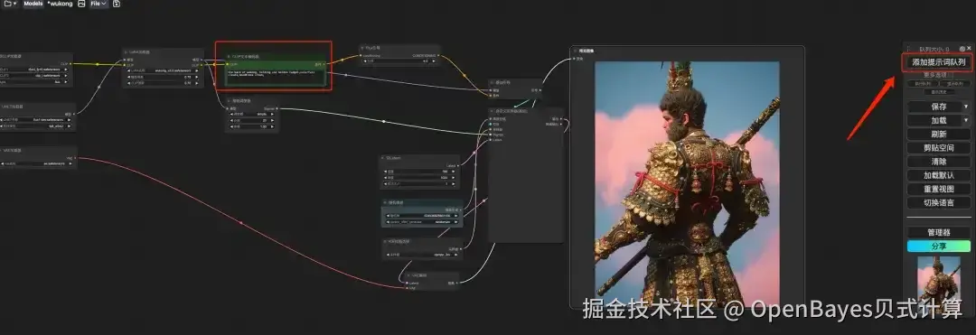 - 选择 「wukong」工作流,在 CLIP 文本生成器中输入 Prompt (例如:the back of wukong, holding one golden cudgel,colorfull clouds,headdress crown),点击「添加提示词队列就可以生成图片」,可以看到生成图片十分精美。