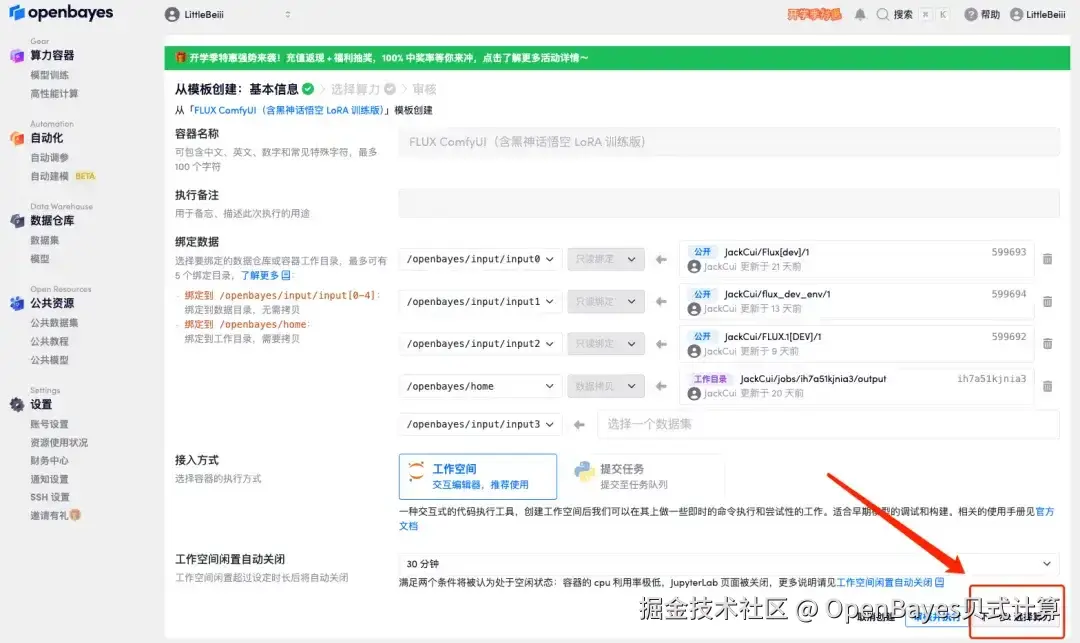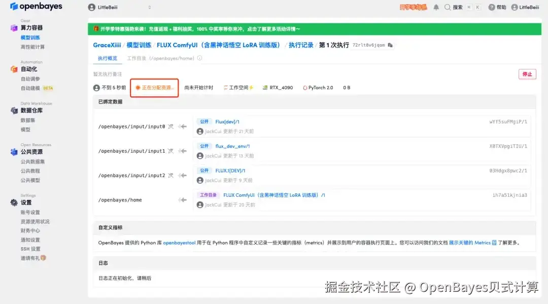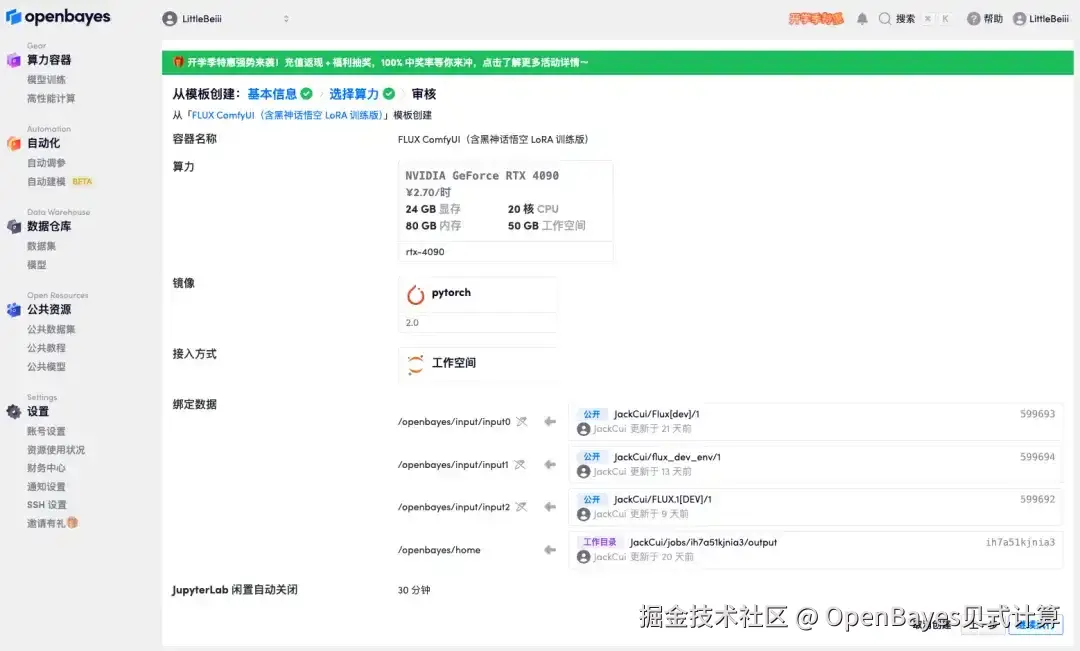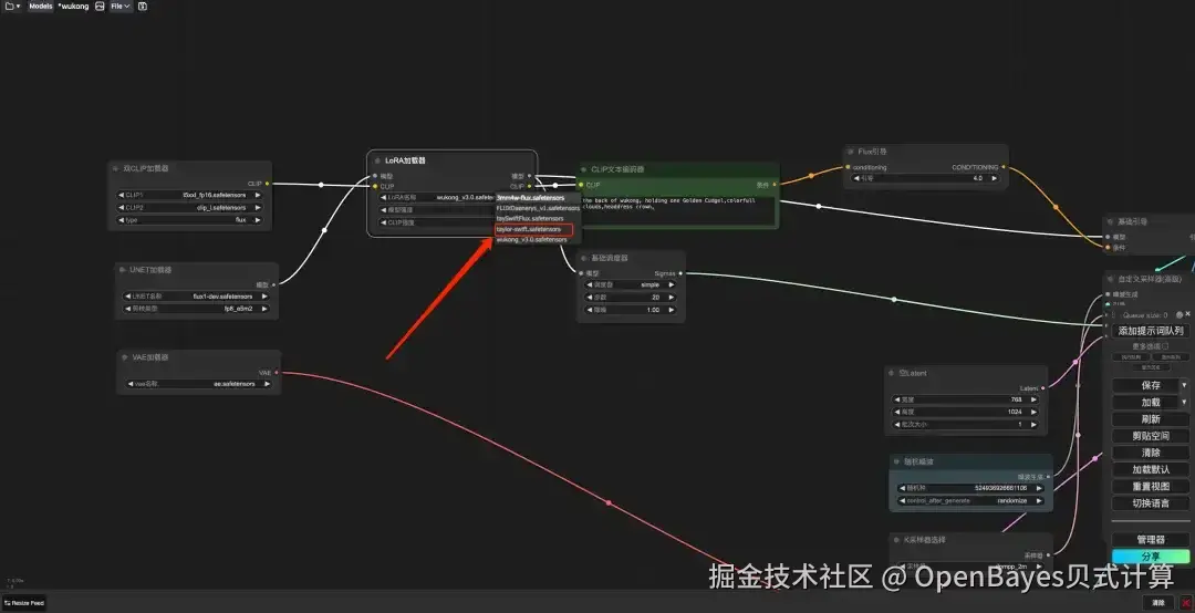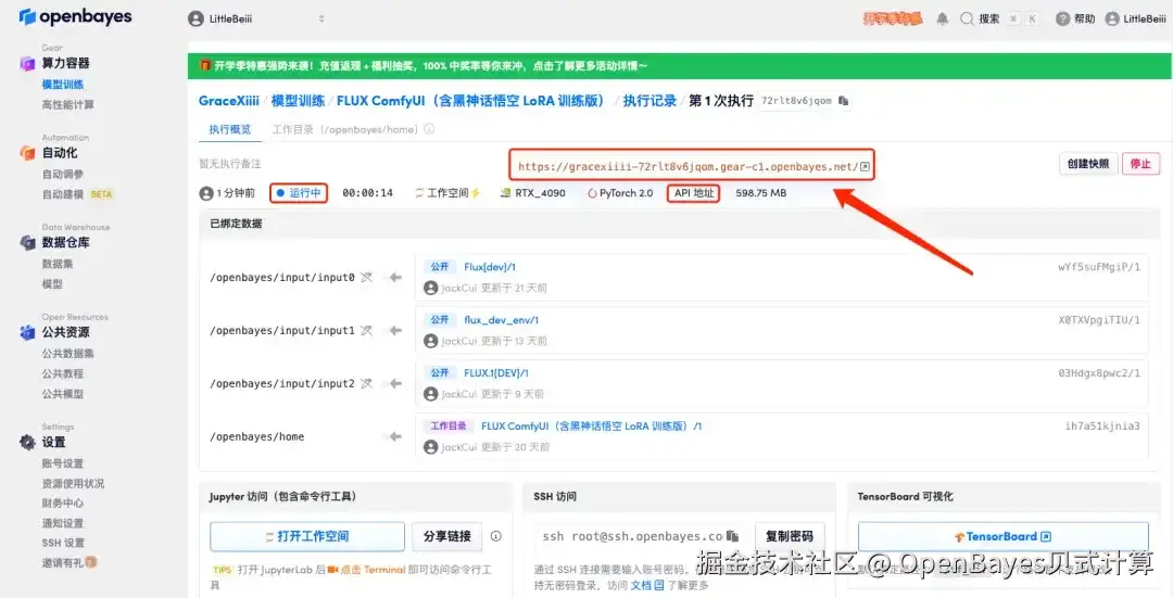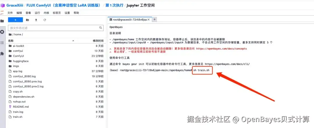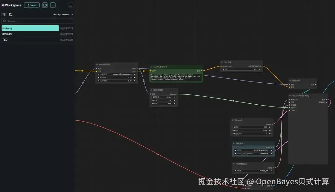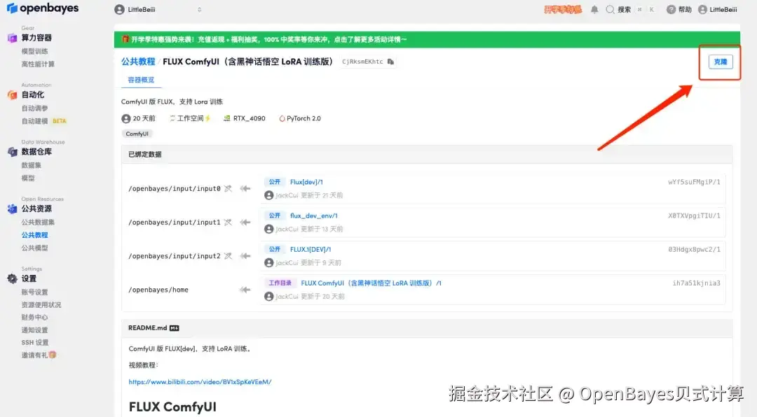B 站热门 Up 主 Jack-Cui 将 FLUX 和 ComfyUI 工作流相结合,制作了 FLUX ComfyUI 教程,该教程不仅包含最近热门游戏黑神话悟空的工作流,还支持一键训练自己的 LoRA 模型生成定制工作流。目前该教程已上线至 OpenBayes 公共教程界面,一键克隆即可立即启动!